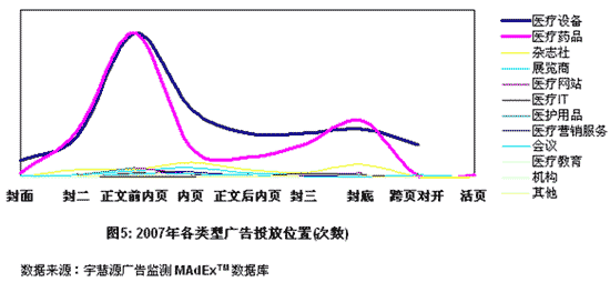 從投放位置來看,封面、封二、封三和封底由于資源有限,投放數(shù)量不多,且基本都被醫(yī)療設(shè)備以及藥品廣告所占據(jù),其他位置中,醫(yī)療設(shè)備和藥品投放位置最多的是正文前插頁(yè)位置。此外,跨頁(yè)對(duì)開這種廣告形式基本只有醫(yī)療設(shè)備廣告主大量使用,其他類型廣告,包括藥品都較少或沒有。(見圖5)