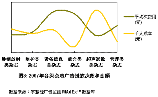 首先,專業(yè)醫(yī)療雜志是有效與大量專業(yè)受眾溝通的工具。例如2007年醫(yī)療器械類產(chǎn)品在宇慧源監(jiān)測(cè)的近百份專業(yè)雜志上的廣告投入總額是3,558萬元左右(根據(jù)刊例價(jià)格計(jì)算),可到達(dá)大約18,142家三級(jí)及以上醫(yī)院,平均每家醫(yī)院的年費(fèi)用是1,961元,而每家醫(yī)院有很多醫(yī)師,平均到每個(gè)醫(yī)師的費(fèi)用則更少。