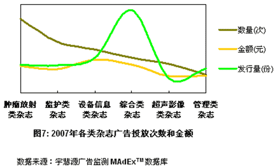 從廣告投放產(chǎn)品來看,藥品根據(jù)其功能主要投放在腫瘤放射、監(jiān)護(hù)和綜合類型的雜志上,設(shè)備信息類和管理類雜志少有涉及;而醫(yī)療設(shè)備廣告則是在設(shè)備信息類雜志上投放最多,其次則是在超聲影像類、監(jiān)護(hù)類雜志上有目的有針對(duì)性的投放(見圖6)。