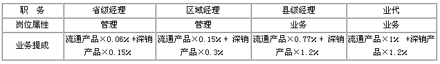 按照公司統(tǒng)一規(guī)定執(zhí)行。特別的,對業(yè)務人員的銷售提成及時兌付,以利于員工的積極性提升。流通產(chǎn)品總體提成比例為1.98%,深銷產(chǎn)品總體提成比例為2.85%,傭金及分配方式如下:
