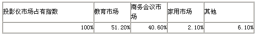 作為大屏幕終端顯示設(shè)備,投影儀的市場(chǎng)需求分為:教育、商務(wù)會(huì)議、家用三種。其2005年中國(guó)國(guó)內(nèi)不同市場(chǎng)的占有指數(shù):