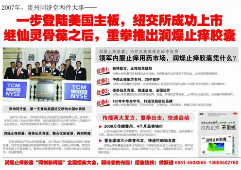 07年10月,潤(rùn)燥止癢經(jīng)銷商大會(huì)取得空前成功,首批共簽約拿貨3500萬(wàn),順利完成新品上市快速進(jìn)入主流商業(yè)渠道的第一步,為后續(xù)高空廣告投放,各級(jí)分銷的開展,終端的鋪貨打下良好的基礎(chǔ).