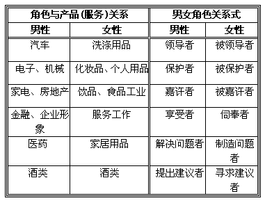 “成功人士”的社會(huì)角色定位是在電視廣告創(chuàng)意中對(duì)理想男性認(rèn)定的第一步。廣告作品所展現(xiàn)的男性形象,幾乎無一例外地從事社會(huì)性和競(jìng)爭(zhēng)開拓性的工作,其職業(yè)多為科學(xué)家、大學(xué)教授、醫(yī)生、工程師、企業(yè)家。他們不僅以技術(shù)和專業(yè)操縱著現(xiàn)代世界,而且以智者、導(dǎo)師、權(quán)威的身份給異性以多種“啟蒙”。電視廣告創(chuàng)意中對(duì)這種男女社會(huì)性別的差異,可以從兩個(gè)維度進(jìn)行考察。(見表一) [5]