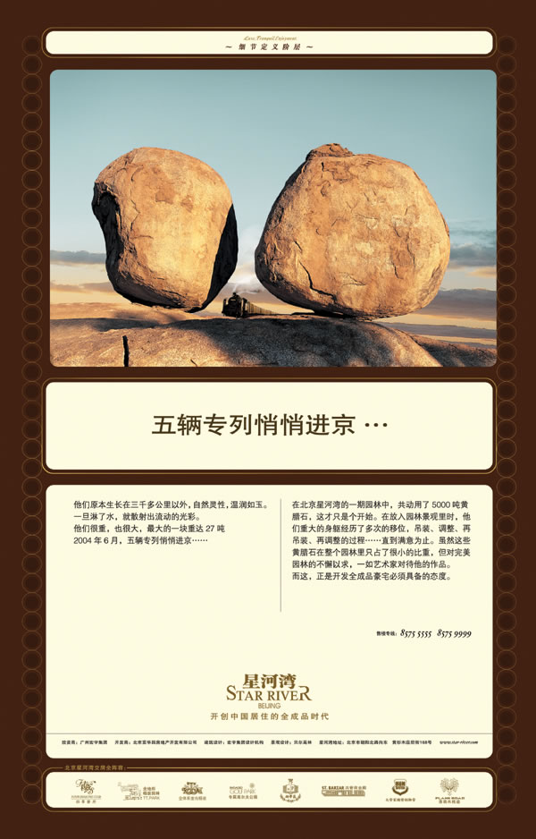 在北京星河灣的一期園林中,共動(dòng)用了5000噸黃臘石,這才只是個(gè)開(kāi)始。在放入園林景觀里時(shí),他門重大的身軀經(jīng)歷了多次的移位,吊裝,調(diào)整,再吊裝,再調(diào)整的過(guò)程......直到滿意為止。雖然這些黃蠟石在整個(gè)園林里只占了很小的比重,但對(duì)完美園林的不懈以求,一如藝術(shù)家對(duì)待他的作品。而這,正是開(kāi)發(fā)全成品豪宅必須具備的態(tài)度。
