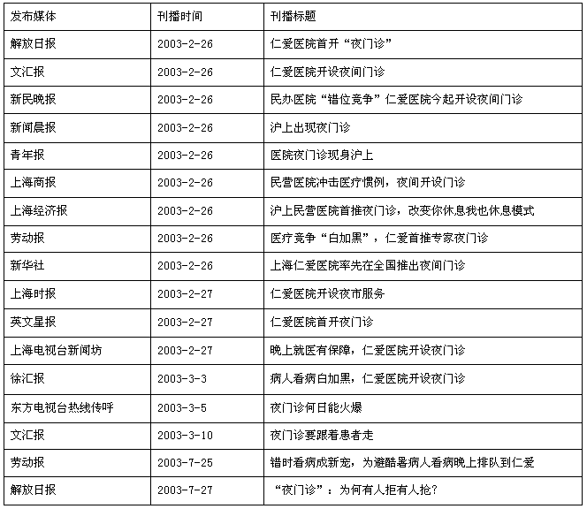 第一方面是媒體的關(guān)注程度,在仁愛醫(yī)院夜門診推出的當(dāng)天,即有將近有二十家媒體進(jìn)行了報(bào)道,(詳見下表),形成了較廣泛的媒體關(guān)注效應(yīng)。隨著夜門診的逐漸延伸,到6月份天氣比較炎熱的季節(jié),夜門診又再次成為媒體關(guān)注的焦點(diǎn),為百姓提供便利的醫(yī)療服務(wù)成為大家媒體所呼吁,再一次使仁愛醫(yī)院成為醫(yī)療行業(yè)關(guān)注的中心,從而使仁愛醫(yī)院在社會(huì)及公眾心中留下良好的社會(huì)形象,這對(duì)民營(yíng)而言是非常難能可貴的。