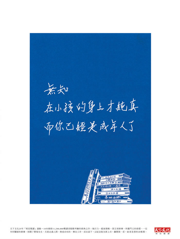 作品類別:傳媒及廣告公司宣傳客戶:天下文化 廣告公司:臺灣奧美廣告 創(chuàng)作總監(jiān):胡湘云 /陳智輝 /謝陳欣 文案:胡湘云 /陳智輝 /陳旸 美術(shù)指導(dǎo):侯君緯