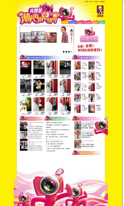 專題頁(yè)面主要由六個(gè)部分構(gòu)成:潮人街拍秀、潮人榜TOP10、潮流心語(yǔ)、活動(dòng)貼吧、時(shí)尚大評(píng)委、視頻專區(qū)。在潮人街拍秀和潮人榜TOP10版塊,網(wǎng)友們可以按照活動(dòng)規(guī)則進(jìn)行街拍照片的上傳和展示,并定期根據(jù)票數(shù)進(jìn)行TOP10的排行;潮流心語(yǔ)部分會(huì)定期的更新時(shí)尚與流行的資訊,給網(wǎng)友提供最新鮮的潮流風(fēng)向標(biāo);時(shí)尚大評(píng)委版塊,定期邀請(qǐng)服裝時(shí)尚界的知名人士對(duì)網(wǎng)友上傳的街拍照片進(jìn)行搭配點(diǎn)評(píng);視頻專區(qū)則是發(fā)布最新的時(shí)尚與潮流的視頻咨詢,讓網(wǎng)友們有最直接的視覺上的享受;活動(dòng)專區(qū)鏈接到“肯德基潮人街拍總動(dòng)員”互動(dòng)專區(qū),定期發(fā)布互動(dòng)及有獎(jiǎng)參與話題,供網(wǎng)友們發(fā)布帖子,交流時(shí)尚觀點(diǎn),展示個(gè)人魅力。