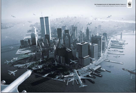 廣告中描述說(shuō)“喪生于海嘯的人比9.11多了百倍”,呼吁人們:“地球是如此強(qiáng)大。尊重她,并保護(hù)