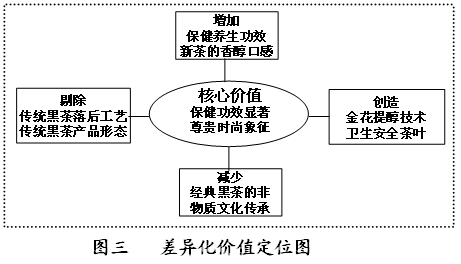 基礎(chǔ),這些都是琥珀•金茶獨(dú)到的價值,是目標(biāo)客戶在其它產(chǎn)品上找不到的價值;其次,明確琥珀•金茶在哪幾個方面要強(qiáng)化,即比現(xiàn)有的兩種可選方案要強(qiáng),在這里我們選擇了新茶的香醇口感優(yōu)于5年藏陳茶,保健養(yǎng)生功效是其他產(chǎn)品所不具有的;第三,在哪些方面我們要弱化,即減少對傳統(tǒng)茶文化的依賴;第四,在哪些方面可以刪除,干脆就不要了,以降低成本,改善客戶體驗(yàn),我們選擇了現(xiàn)代制茶技術(shù)和工藝,不采用傳統(tǒng)的產(chǎn)品形態(tài),既保證了食品衛(wèi)生,又提高了產(chǎn)品品質(zhì)穩(wěn)定性和產(chǎn)量。(見圖三)