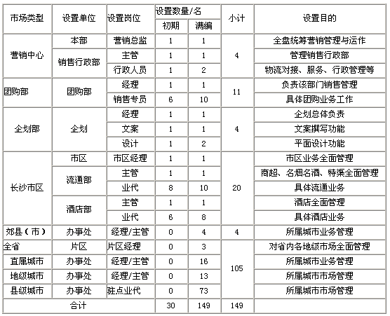 ◇長(zhǎng)沙市區(qū)流通、酒店、團(tuán)購(gòu)等部門市場(chǎng)開(kāi)發(fā)初期也不滿編,待市場(chǎng)開(kāi)發(fā)有一定基礎(chǔ)后根據(jù)市場(chǎng)實(shí)際需要增編。