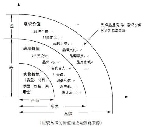 服裝品牌勢能的來源是多方面的,主要包括:高品質(zhì)產(chǎn)品和服務(wù)、出色的品牌銷售形象、知名設(shè)計師、品牌歷史與文化、原產(chǎn)地效應(yīng)、廣告宣傳、明星代言等等。歸結(jié)起來,可以總結(jié)為實物價值、外在形式、和意識價值三個層級。服裝品牌的價值構(gòu)成要素也同時是服裝品牌勢能的構(gòu)成要素: