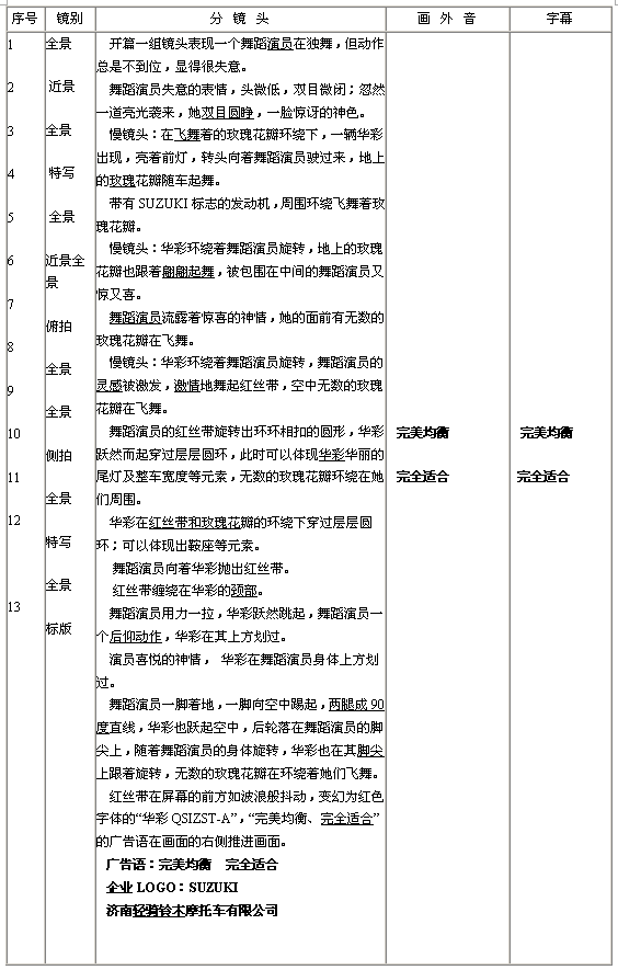 本創(chuàng)意緊密配合產(chǎn)品的平面表現(xiàn),通過一個舞蹈演員開始動作不到位而顯失意,華彩的出現(xiàn)激發(fā)起她的舞蹈靈感,與華彩一起翩翩起舞,華彩似乎也具備了人性的色彩,她們配合默契,在高難度的動作上也達到了完美的均衡,達到人車合一的境界;最終體現(xiàn)出“完美均衡 完全適合”的廣告素求。