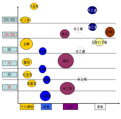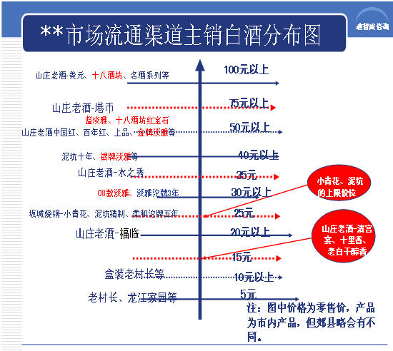 通過大量的走訪終端、分銷客戶和部分消費(fèi)者以及該市場(chǎng)的白酒業(yè)務(wù)代表,獲取了第一手的產(chǎn)品分布和價(jià)格構(gòu)成資料,然后根據(jù)得到的產(chǎn)品價(jià)格信息,按照價(jià)格由低到高縱向按軸線繪出該市場(chǎng)的產(chǎn)品結(jié)構(gòu)圖,根據(jù)該圖,市場(chǎng)競(jìng)爭(zhēng)產(chǎn)品及其市場(chǎng)地位一目了然。