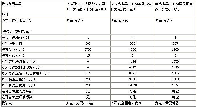 注:水費都不計算在內(nèi)。以(冬季)日產(chǎn)熱水160千克/45℃(事實上太陽能加熱水溫遠遠高于45℃)為基準,燃氣熱水器平均5年費用為6620元;電熱水器平均5年費用為7750元;太陽能熱水器的總投資為5780元,所以說太陽能熱水器用不了5年就可收回總投資又可免費使用10多年。(以上太陽能熱水器相關數(shù)據(jù)根據(jù)皇明太陽能產(chǎn)品提供)