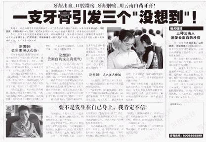 當時擺在我們面前的關(guān)鍵問題是,如何迅速明確云南白藥牙膏的定位,制訂正確的傳播和營銷策略,最快地拉動銷售,同時給營銷隊伍以信心,給經(jīng)銷商以信心。