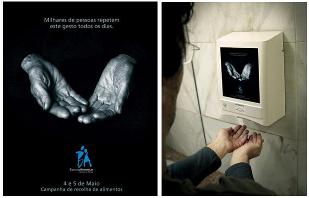 這是葡萄牙里斯本FCB為Food Bank慈善組織開(kāi)展的募捐宣傳。這雙“乞求的手”該發(fā)布在什么地方呢?在尋找中,創(chuàng)意人員注意到了衛(wèi)生間的烘手機(jī)。通過(guò)巧妙利用人們烘手的動(dòng)作,與海報(bào)里的手勢(shì)形成鮮明對(duì)比。同一手勢(shì),但目的不同,前者在做這個(gè)動(dòng)作時(shí)通常是下意識(shí)的,而后者則是由于饑餓。海報(bào)的主題是:“每天都有數(shù)百萬(wàn)人重復(fù)著這個(gè)手勢(shì)!