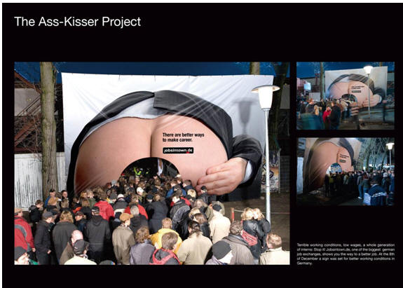 這是德國(guó)漢堡市Scholz & Friends為求職網(wǎng)站jobsintown.de發(fā)布的廣告。jobsintown.de之前以“Life’s too short for the wrong job!”為主題的戶外系列曾在倫敦廣告獎(jiǎng)等評(píng)獎(jiǎng)中普遍受到好評(píng),這次這個(gè)“走”廣告也夠獨(dú)特。這個(gè)廣告就發(fā)布在招聘會(huì)的門口,大大的肛門成了會(huì)場(chǎng)的入口,多少讓人感覺(jué)不爽,不過(guò)看到廣告語(yǔ)“There are better ways to make career.”和網(wǎng)站的LOGO或許能夠釋然。不過(guò)這樣的作品能不能獲得招聘會(huì)主辦方的允許值得懷疑,因?yàn)樗麄冎g是競(jìng)爭(zhēng)關(guān)系。