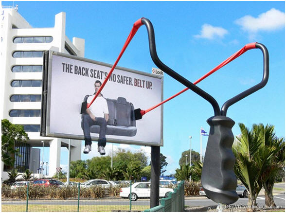 這是澳大利亞Clement BBDO創(chuàng)作的一則獨(dú)特的交通安全廣告。提醒人們注意后座安全,除了司機(jī)要系安全帶,坐在后排的人最好也系上安全帶。否則,當(dāng)司機(jī)突然剎車時(shí),后排的人會(huì)因慣性而彈出窗外。這個(gè)模擬成彈弓的廣告牌,把這種危險(xiǎn)演繹得淋漓盡致。不但主題新穎,媒介使用也不落俗套。這個(gè)廣告牌通過(guò)對(duì)立體、動(dòng)態(tài)、驚險(xiǎn)等“煽情”因素的渲染,必將引得路人側(cè)目,繼而會(huì)心一笑。