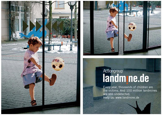 這是德國(guó)法蘭克福JWT為德國(guó)反地雷組織(Actiongroup Landmine.de)創(chuàng)作的戶外作品。(圖11)在玻璃門上,一個(gè)天真可愛(ài)的小男孩兒在踢球,當(dāng)門打開(kāi)時(shí),小男孩的左腿就與身體分開(kāi),瞬間變成“殘疾”。左側(cè)門上:“每年有數(shù)以千計(jì)的兒童受害。100萬(wàn)枚地雷仍在發(fā)現(xiàn)中。幫助我們:www.landmine.de!边@個(gè)環(huán)境媒體作品正是通過(guò)消費(fèi)者的無(wú)意識(shí)參與,讓他們不經(jīng)意間體驗(yàn)地雷對(duì)人類尤其是孩子們的威脅。不過(guò),行人匆匆,當(dāng)打開(kāi)門時(shí),就已經(jīng)跨到門外了,很難注意到打開(kāi)門后廣告所呈現(xiàn)的效果,而且要讓人停下來(lái)去閱讀那一行字,除非廣告有強(qiáng)大的吸引力,或者行人明白了廣告主題,否則要讓行人專門站在邊上體驗(yàn)廣告的精妙,但這可能嗎?