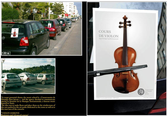 這是突尼斯Memac Ogilvy Label公司為一家名為Ilyes Jaryan的音樂(lè)學(xué)校開(kāi)展的“小提琴”廣告(圖12)。又是一次騷擾車主的游擊戰(zhàn),不過(guò)這次卻做得高明一些。整個(gè)海報(bào)上就一把小提琴,被夾放到雨刷下面,猛然看去,雨刷變成了小提琴的琴弓,從而構(gòu)成了一個(gè)完整提琴,在體現(xiàn)主題上不失為聰明之舉。只是在車主惱火地上前扯掉這些海報(bào)時(shí),就未必能發(fā)現(xiàn)和感受其中的聰明了。