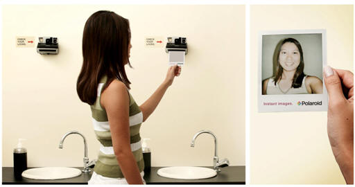 這是巴西Santa Clara公司為寶麗萊(Polaroid)照相機(jī)創(chuàng)作的實(shí)物展示性廣告。(圖13)衛(wèi)生間里原來(lái)的化裝鏡被寶麗萊照相機(jī)替代,只要你愿意,一張快照即刻在手。女士化完妝可拍張照看看整體效果,更可帶回留念。這是一種參與性很強(qiáng)的環(huán)境媒體廣告,其中的新奇、好玩可以有效激發(fā)消費(fèi)者的參與。但這個(gè)廣告的最大問(wèn)題就是可控制性差,無(wú)法防止一些人的反復(fù)甚至惡意使用,最終導(dǎo)致耗材和電力的大量消耗,甚至很快就會(huì)讓照相機(jī)變成無(wú)法拍照的擺設(shè),不能不說(shuō)是整個(gè)作品創(chuàng)意的一大缺憾。