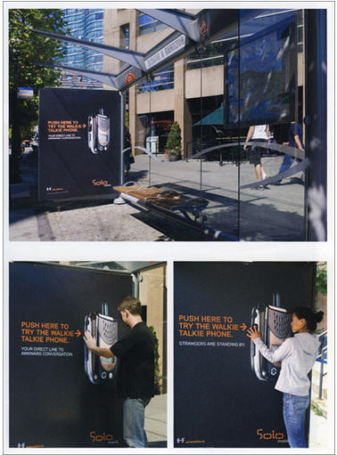 這是加拿大范庫(kù)弗峰市Rethink公司為SOLO手機(jī)設(shè)計(jì)的互動(dòng)性體驗(yàn)廣告。在多倫多、范庫(kù)弗峰、卡爾加里、蒙特利爾等城市一些公交候車廳里安裝了許多巨型SOLO手機(jī),手機(jī)一側(cè)的提示語(yǔ)是“按一下這里試試這款對(duì)講手機(jī)(walkie talkie phone)”,同時(shí)一個(gè)箭頭指向手機(jī)一側(cè)的對(duì)講鍵。只要你按下這個(gè)對(duì)講鍵,就可以跟其他手機(jī)實(shí)現(xiàn)對(duì)講。