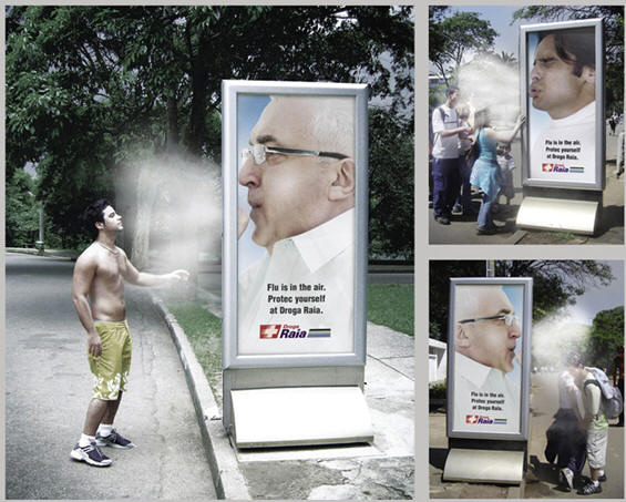 這是巴西QG公司為巴西著名藥品連鎖店Droga Raia創(chuàng)作的公益性廣告。這些廣告發(fā)布在巴西著名的IBIRAPUERA觀光公園里。通過(guò)在廣告箱里安裝的噴霧設(shè)備和巧妙的視覺(jué)設(shè)計(jì),讓蒸汽就像噴嚏一樣從模特的鼻孔噴出。當(dāng)人們懷著好奇走近時(shí)會(huì)看到:“流感就在空氣中。保護(hù)好自己!毕旅媸荄roga Raia連鎖店的標(biāo)志。好奇的路人可以躬身細(xì)看究竟,也可以伸臉體驗(yàn)一下噴霧。簡(jiǎn)單、便捷的參與設(shè)計(jì),大大提高了體驗(yàn)深度。