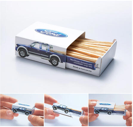這是馬來(lái)西亞JWT廣告公司為福特汽車創(chuàng)作的在今年亞太節(jié)上的獲獎(jiǎng)作品——一個(gè)印有福特皮卡的火柴盒。該創(chuàng)意通過(guò)抽拉火柴盒來(lái)傳達(dá)福特這款皮卡的新功能,即通過(guò)一個(gè)擴(kuò)展裝置能增加30%的載貨量。因?yàn)橘?gòu)買皮卡的消費(fèi)者一般都是運(yùn)輸或工程等行業(yè)的從業(yè)者,所以這款火柴盒的投放地點(diǎn)就選定在這些從業(yè)者容易聚集的酒吧里。當(dāng)人們打開(kāi)火柴盒時(shí),對(duì)這款汽車的新特點(diǎn)就有了非常直觀的認(rèn)識(shí)。這是聰明的“強(qiáng)迫式”設(shè)計(jì),當(dāng)目標(biāo)受眾使用火柴盒時(shí),就無(wú)法拒絕參與廣告的傳播。