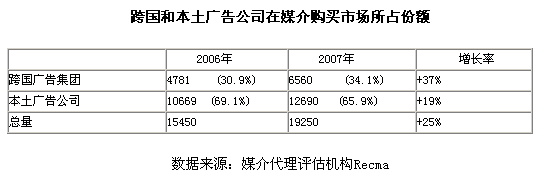 媒介購(gòu)買:跨國(guó)廣告公司旗下龐大的媒介購(gòu)買子集團(tuán)憑借資金優(yōu)勢(shì)和客戶整合能力在媒介購(gòu)買市場(chǎng)上也迅速崛起,但本土公司有一定價(jià)格優(yōu)勢(shì)。在中國(guó)媒介購(gòu)買市場(chǎng)上跨國(guó)廣告公司擁有的專業(yè)媒介購(gòu)買集團(tuán)的份額不斷擴(kuò)大,六大跨國(guó)廣告集團(tuán)[5]瓜分了媒介購(gòu)買市場(chǎng)34%的市場(chǎng)份額,其余66%由分散在全國(guó)各地的本土獨(dú)立廣告公司分享。而本土廣告公司雖然沒(méi)有雄厚的資金實(shí)力和客戶整合能力,但通常和一些媒體有著特定的關(guān)系,有一定的價(jià)格優(yōu)勢(shì),因而在夾縫中得以生存。