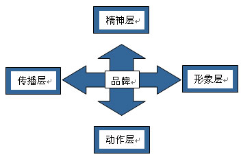 對于品牌的認識,不能只停留在一個名稱,一句廣告語上,這些只是最外層的品牌表象。實際上,品牌是全方位立體式的,包含有四個層面:品牌精神、品牌形象、品牌傳播和品牌動作。(如圖所示)品牌精神是理念和內(nèi)涵,品牌形象將抽象的具象化,品牌傳播擴展知名度,品牌動作則將品牌理念變成實實在在的行為。四者一起構(gòu)成了完整意義上的品牌,缺一不可,并相互關(guān)聯(lián),相互影響,共同作用,促進品牌健康全面成長。