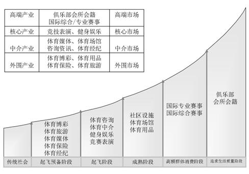 中國體育市場發(fā)展至今,形成了6個階段:傳統(tǒng)社會、起飛預(yù)備階段、起飛階段、成熟階段、高額群體消費階段、追求生活質(zhì)量階段等。