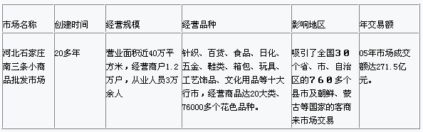 河北省會(huì)城市石家莊的大中型中轉(zhuǎn)地批發(fā)市場(chǎng)對(duì)該地形成了大商業(yè)、大流通、大市場(chǎng)格局有著積極的意義,它們輻射面廣、規(guī)模經(jīng)濟(jì)效益顯著,對(duì)區(qū)域經(jīng)濟(jì)有重大影響。