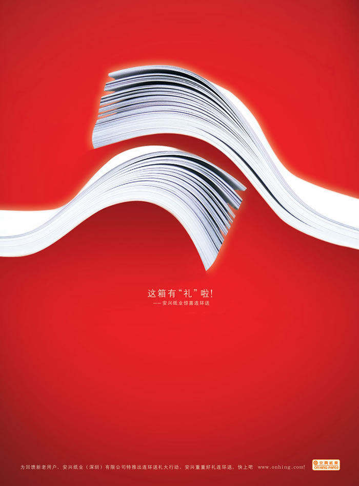 客戶:安興紙業(yè) 廣告公司:深圳采納品牌營(yíng)銷顧問(wèn) 創(chuàng)作總監(jiān):仟博儒 /張林 /余軍榮 文案:張斌 /李春貴 美術(shù)指導(dǎo):張林 /黎毅進(jìn) 字體設(shè)計(jì):黎毅進(jìn) 簡(jiǎn)介描寫(xiě):這箱有“禮”啦!