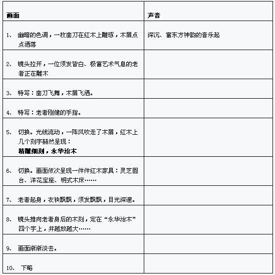 作為導演,我深知這是一個執(zhí)行難度很大的企業(yè)宣傳片。為什么這樣說?因為它的美術要求極高,幾乎每一個畫面都要求高雅、精細,創(chuàng)意中還設計了諸如明代文人、白須老匠、傳統(tǒng)的紅木制作工坊等元素——這些元素已大大超出常規(guī)企業(yè)宣傳片的范疇,而更像一個30秒電視廣告。正因為此,我當時便同制作組的人提了一個要求:把這條片子當成一個30秒電視廣告來做。