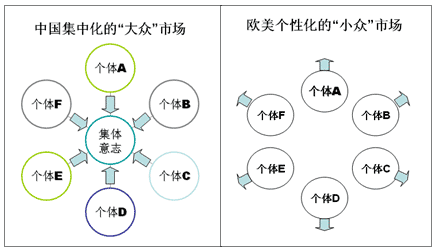 在“個人主義”大行其道的歐美,需求不斷地被細(xì)分,形成不同的“小眾需求”,營銷者提出“差異化營銷”,更有甚者提出“長尾需求”,個性化、一對一、DIY等被鼓吹碰上了天,然而用這種“先進(jìn)”的歐美模式套在中國的大眾市場上,就如同把老外穿的人高馬大的外套罩在偏瘦小的中國人身上一樣的不合時宜的滑稽。