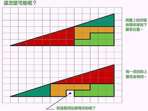 深入這個話題之前,先看一個小插曲,網上的三角型面積問題。如下圖,同樣不同顏色的四小塊,不同擺法,擺成同樣的三角型,面積卻差了一個單元。至于其中原由,我用各種公式和面積組合法推導了半天,還是無能為力,覺得不可思議。