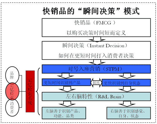 我們分析了“快銷品”的最本質(zhì)特征在于購買行為的“瞬間決策”,而在琳瑯滿目的快銷品里,如何才能在瞬間“對號入座”讓消費(fèi)者選擇您的產(chǎn)品呢?那就是針對對左右腦展開不同的“記憶檢索”,使得消費(fèi)者以更快的速度認(rèn)知您的產(chǎn)品,認(rèn)知他們的狀態(tài)。
