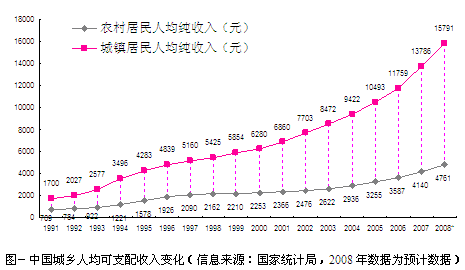 圖-中國(guó)城鄉(xiāng)人均可支配收入變化(信息來(lái)源:國(guó)家統(tǒng)計(jì)局,2008年數(shù)據(jù)為預(yù)計(jì)數(shù)據(jù))