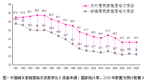 圖-中國(guó)城鄉(xiāng)家庭恩格爾系數(shù)變化(信息來(lái)源:國(guó)家統(tǒng)計(jì)局,2008年數(shù)據(jù)為預(yù)計(jì)數(shù)據(jù))