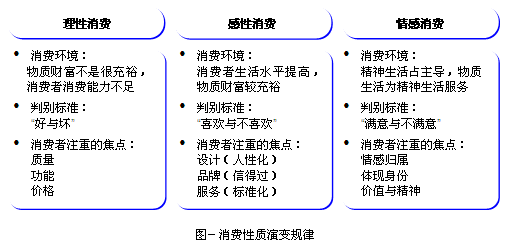 我們把消費(fèi)者的消費(fèi)性質(zhì)分為三個(gè)階段,即:理性消費(fèi)階段、感性消費(fèi)階段和情感消費(fèi)階段(如下圖),就會(huì)看出它演變的規(guī)律。