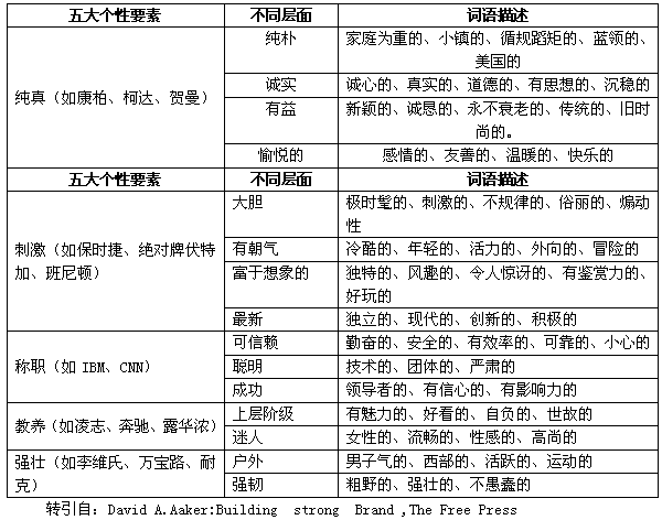 一個品牌有哪些個性呢?這里首先介紹一下品牌專家大衛(wèi)•艾克在品牌個性研究方面的成果。它使用了品牌個性尺度(BPS,Brand Personality Scale)對1000位美國受訪者、60個具有明確個性的品牌展開調(diào)查。這項調(diào)查使用五大個性要素“純真、刺激、稱職、教養(yǎng)和強壯”幾乎可以解釋所有品牌(93%)之間的差異:
