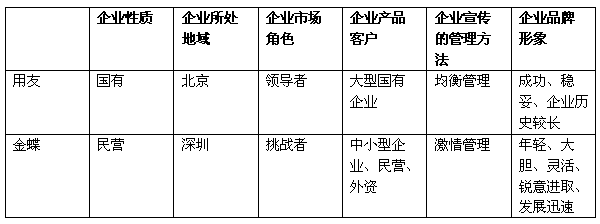 金蝶軟件從介入市場(chǎng)開始,即定位于開發(fā)生產(chǎn)中小型企業(yè)、外資企業(yè)、民營企業(yè)的財(cái)務(wù)軟件,他們以挑戰(zhàn)者的身份快速切入。在對(duì)品牌定位上,他們分析了競爭環(huán)境的特點(diǎn):用友在北京,并以國有企業(yè)為主要客戶,是市場(chǎng)的領(lǐng)導(dǎo)者,在新聞宣傳上,他們提出了“均衡管理”,即管理、營銷、生產(chǎn)、技術(shù)等多方面均衡發(fā)展,在文化上,有著“溫文爾雅”、“溫柔敦厚”的古代文化風(fēng)格,成功而有教養(yǎng)。