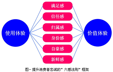 找到“六感”,我們就知道到底是什么將我們的“使用體驗(yàn)”推向“價(jià)值體驗(yàn)”。因此,我們暫時(shí)省略“感性體驗(yàn)”與“理性體驗(yàn)”的細(xì)分環(huán)節(jié),把圖進(jìn)一步簡(jiǎn)化,就可以得到下面的這張圖,即:“提升消費(fèi)者忠誠(chéng)的‘六感’法則”基本框架(如下圖)。