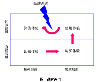 然而,對(duì)一個(gè)品牌來講,這些陷阱都可以避免,而且就算陷進(jìn)去了,也可以爬出來,繼續(xù)戰(zhàn)斗。但是,從“使用體驗(yàn)”再向“價(jià)值體驗(yàn)”邁進(jìn)的時(shí)候,如果你陷入深淵,就很難有回頭路了。所以,我們把這一環(huán)節(jié)叫做“品牌鴻溝”(如下圖)。