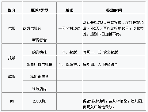 采取電視、報(bào)紙、DM、POP與大海報(bào)相結(jié)合的廣告宣傳方式,以優(yōu)劣互補(bǔ),時(shí)間互補(bǔ),有效發(fā)揮組合營(yíng)銷特色。全方位影響消費(fèi)者。前期造勢(shì)、傳遞信息、提高知名度,樹立良好的品牌形象,并配合促銷活動(dòng),來提高銷售業(yè)績(jī)。
