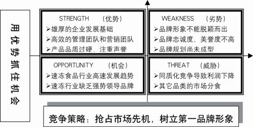 對競品進行搶先占位就必須找到當(dāng)今的速凍食品行業(yè)具有排他性、優(yōu)越性的概念領(lǐng)地,并且思念自身的資源優(yōu)勢能夠支撐這個領(lǐng)地,在此我們對思念品牌進行了如下SWOT分析: