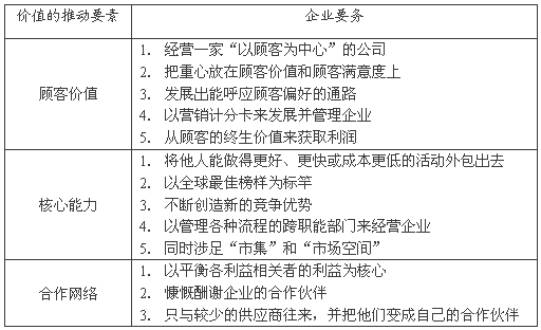 由此,我們看到了塑造今日市場(chǎng)的三大關(guān)鍵要素:顧客價(jià)值、核心能力及合作網(wǎng)絡(luò)(詳見(jiàn)下表)。