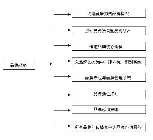 品牌戰(zhàn)略,簡(jiǎn)而言之:是以品牌DNA為中心建立品牌識(shí)別系統(tǒng),統(tǒng)帥整合企業(yè)一切價(jià)值活動(dòng),表現(xiàn)在市場(chǎng)與消費(fèi)者的就是營(yíng)銷傳播活動(dòng),最大限度,合理利用品牌資產(chǎn),產(chǎn)品,包裝,形象,廣告,公關(guān),新聞,終端,服務(wù),整合,傳播。同時(shí)優(yōu)選品牌架構(gòu),不斷來(lái)推進(jìn)品牌資產(chǎn)增值。
