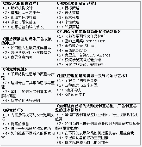 廣告創(chuàng)意總監(jiān)培訓(xùn)是利用節(jié)假日時(shí)間,歷時(shí)2個(gè)月,每月1次授課,每次2至3天,集中面授,可以使業(yè)務(wù)繁忙的一線管理者實(shí)現(xiàn)“工作、學(xué)習(xí)兩不誤”。具體授課日期將提前一月事前通知,以便學(xué)員安排參訓(xùn)時(shí)間。