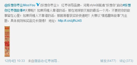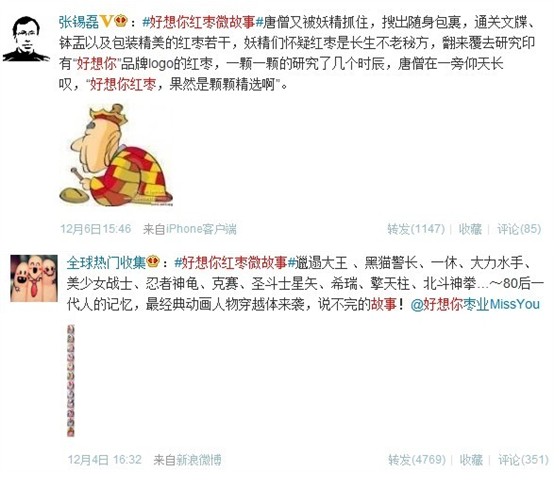 “好想你”是大眾詞匯,直接說好想你,難以聯(lián)想到紅棗,但“紅棗領導品牌”又太長,影響話題傳播,綜合考慮最終用#好想你紅棗微故事#作為話題,進行段子營銷。